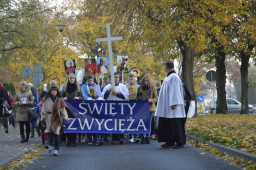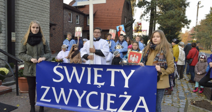 Pochód Świętych wyruszył 31 października o godz. 16.00 spod kościoła św. Jerzego w Goleniowie. Niesiono relikwie św. Jerzego, św. Jana Pawła II, bł. ks. Jerzego Popiełuszki i bł. ks. abpa Jerzego Matulewicza. Dzieci przebrały się za swoich ulubionych świętych a dorośli nieśli wizerunki swoich świętych patronów. Pochód zakończył się pod krzyżem na cmentarzu komunalnym. Fot. M. Palica.