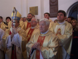 od lewej na klęczniku: bp Czesław Kozon z Kopenhagi, abp Andrzej Dzięga, ks. Jan Zalewski