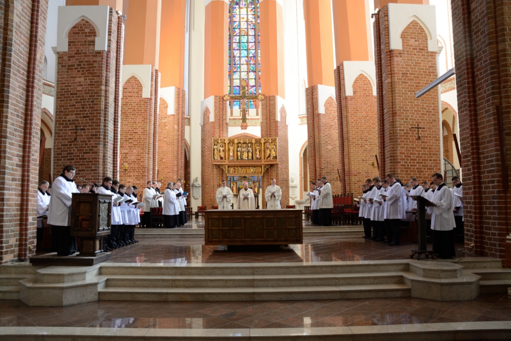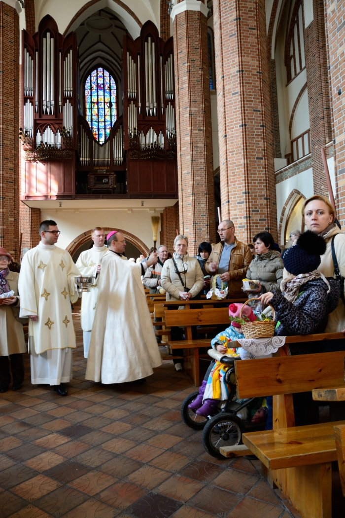 Rano, w Wielką Sobotę, ks. bp Henryk Wejman przewodniczył w Bazylice Archikatedralnej w Szczecinie Liturgii Godzin. Po zakończeniu nabożeństwa dokonał poświęcenia pokarmów. Fot. D. Rynkiewicz.