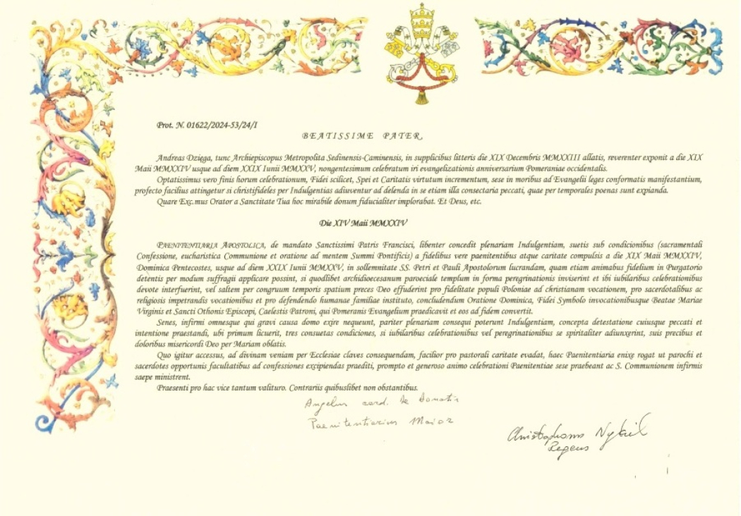 Penitencjaria Apostolska zwróciła się do Ojca Świętego Franciszka o łaskę odpustów na Rok Jubileuszowy 900-lecia Pomorskiej Misji św. Ottona z Bambergu: