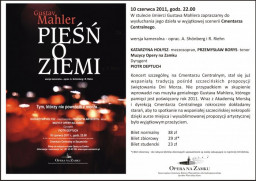 10 czerwca 2011 roku, wieczorną porą (godz. 22.00), przestrzeń Cmentarza Centralnego w Szczecinie wypełnią głęboko poruszające dźwięki Pieśni o ziemi Gustava Mahlera – symfonii wokalnej na dwa głosy solowe. Przeżywające od kilkunastu lat wielki renesans popularności kompozycje austriackiego kompozytora należą do najwybitniejszych dzieł symfoniki oraz liryki wokalnej okresu późnego romantyzmu, silnie wiążąc się z niespokojnym duchem wiedeńskiej secesji. Symfonia, która będzie zaprezentowana podczas koncertu dedykowanego Tym, którzy nie powrócili z morza, jest nie tylko jednym z najgłębszych i tajemniczych dzieł Mahlera, ale także jednym z najbardziej poruszających utworów muzycznych inspirowanych tajemnicą istnienia i transcendencji. Pieśń o ziemi, skomponowana do wierszy poetów chińskich w niemieckim przekładzie Hansa Beghtego, łączy dwie kultury – Wschodu i Zachodu - dotykając granicy życia i śmierci, wieczności i przemijania.
