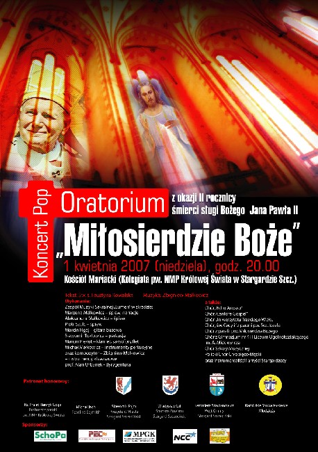 Wielki Koncert Pop – Oratorium „Miłosierdzie Boże” z okazji II rocznicy śmierci sługi Bożego Jana Pawła II odbędzie się 1 kwietnia 2007 (niedziela), godz. 20.00. w Kościele Mariackim (Kolegiata pw. NMP Królowej Świata w Stargardzie Szczecińskim)