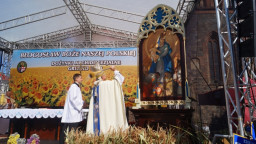 Gryfińskie dożynkowe uwielbienie Boga za szczęśliwe i błogosławione zakończenie tegorocznych zbiorów żniwnych rozpoczęło się od prezentacji przywiezionych wieńców żniwnych, której głównym animatorem był miejscowy wikariusz ks. dr Andrzej Supłat. Każda delegacja ukazywała przed ołtarzem swój wytwór nie tylko dokonując swego przedstawienia się, ale także starając się przybliżyć taki a nie inny wymiar symboliki wieńca żniwnego. W ten sposób powstała imponująca mozaika fascynujących i zadziwiających swym pięknem wieńców oraz niezapomniana opowieść o ich tworzeniu. Miłym zaskoczeniem była obecność na dożynkach Kapeli Góralskiej z Zawoi zaproszonej przez parafię w Pniewie. Piękny wiejski folklor podkreślił również Zespół Ludowy Macierzanka z Pacholąt (parafia w Lubiczu). Eucharystii Dożynkowej przewodniczył ks. abp. Andrzej Dzięga w koncelebrze z 20 kapłanami. Obecni byli również, szczecińscy parlamentarzyści, przedstawiciele władz wojewódzkich, władz samorządowych powiatów i gmin, służb mundurowych, rektorzy wyższych uczelni Szczecina, reprezentanci szeroko pojętego świata pracy. Przed rozpoczęciem dziękczynnej Eucharystii ks. arcybiskup dokonał wzruszającego poświecenia trzech kopii Obrazu MB Królowej Korony Polskiej – Hołd Stanów, królującego w ołtarzu głównym kościoła w Gryfinie, który przywiózł ks. Jan Palica z pierwszymi osadnikami z Kałusza. Pierwsza wierna kopia będzie służyła do licznych procesji a dwie następne dotrą właśnie do Kałusza oraz do Raciechowic – miasta partnerskiego dla Gryfina. Obraz gryfiński z woli ks. abp. ma być koronowany w 2020 roku a więc tegoroczne świętowanie przy nim wpisuje się w sposób istotny w budowanie charyzmatu promieniowania Matki Najświętszej. O godności Dziękczynienia za Plony świadczyły także odczytane dwa listy – pozdrowienia od najwyższych władz państwowych. Najpierw minister Paweł Mucha w imieniu Prezydenta RP Andrzeja Dudy odczytał głębokie przesłanie: „Dożynki to święto zakorzenione w staropolskiej tradycji i wpisane w naszą tożsamość. Praca na roli, szacunek do ziemi dającej chleb w wielkiej mierze ukształtowały polska kulturę. Ze świętem dożynek łączą się najbardziej fundamentalne wartości. To czas dziękczynienia Opatrzności za dar chleba powszedniego, to czas radości dumy z dobrze wykonanej pracy. W imieniu Rzeczypospolitej Polskiej pragnę podziękować wszystkim rolnikom ziemi zachodniopomorskiej za ofiarny wysiłek”. Dopełnieniem troski władz państwowych o sektor rolnictwa były słowa premiera Mateusza Morawieckiego odczytane przez wicewojewodę Marka Subocza. W tym dożynkowym tryptyku głos zabrał także ks. Kan Waldemar Gasztkowski – Diecezjalny Duszpasterz Rolników, który wprowadził wszystkich w klimat uwielbienia Boga za dar chleba. Na wstępie do Eucharystii Metropolita Szczecińsko – Kamieński wyraził hołd władzom państwowym za ich słowa a także zaprosił zgromadzonych do wyrażenia wdzięczności tym, którzy trudzili się podczas niełatwych tegorocznych zbiorów aby wszystko czym nas obdarował Bóg nie zostało uronione: „Patrzyłem na te wieńce, dobraliście w tym roku kłosy szczególne. Jest tu srebro i złoto, są polskie kwiaty i jest polska modlitwa i polska praca i także polskie serca. Razem z Wami chcę dziękować Bogu za plony tego roku. Wielu mówi, że skromniejsze ale są! Razem z wami chcę prosić o błogosławieństwo dla polskiej ziemi, dla polskich rolników, sadowników, działkowiczów, dla wszystkich pod których dłońmi chleb wyrasta!” Starostowie Dożynek Agnieszka i Andrzej Mierzejwscy z Gryfina przynieśli do ołtarza chleb ofiarowując go Dostojnemu Celebransowi, prosząc jednocześnie o odprawienie mszy św. w intencji rolników oraz sprawiedliwego dzielenia chleba przez cały rok. W Słowie Bożym ks. abp. Andrzej Dzięga przypomniał najpierw głęboką, polską, wiejską symbolikę Obrazu MB Kr. Korony Polskiej z Kałusza. Następnie z wielka wrażliwością serca mówił o wielu trudnych wymiarach pracy na roli i znaczeniu mądrego ustawodawstwa państwowego wspierającego rolników: „Pamięta o tym mądry rolnik, że z Bogiem się rozlicza nie tylko w czasie zbiorów ale staje także przed Bogiem wtedy gdy patrząc na ziemię, która jest w jego zarządzie rachuje co, gdzie będzie zasiewał i wie dlaczego, gdy wpuszcza pług w ziemię to też z Bogiem rozmawia. Gdy ziarno wrzuca na zasiew to też z Bogiem rozmawia. Gdy to ziarno dobiera by było siewne to też to Bożemu czyni. A potem gdy patrzy z troską na porę kwitnienia, gdy ziarno wzrasta, gdy nabiera tej siły żywotnej nieustannie trwa na modlitwie. Dziękuję kapłanom i wam rolnikom, że przybywa na naszej ziemi błogosławieństwa nad polami, nad zasiewami, nad rolniczymi sprawami, których wzrost od Boga zależy.”