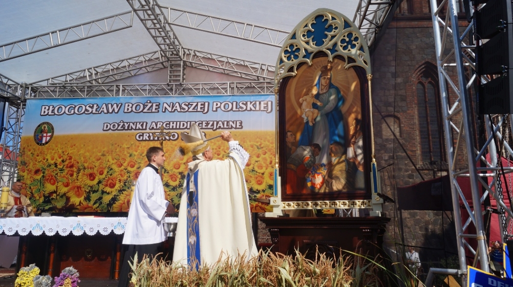Chleb od wieków jest owocem pracy rolników. Na polach, które oni uprawiają, w złocistych łanach pszenicy i żyta, rodzi się nasz chleb powszedni, o który modlimy się do Boga słowami: „chleba naszego powszedniego daj nam dzisiaj” (Łk 11,3). Ponieważ wszyscy - nie tylko mieszkańcy wsi, ale także miast i miasteczek - w równym stopniu przyjmujemy i spożywamy chleb „owoc ziemi i pracy rąk ludzkich” powinniśmy razem wyrazić nasze dziękczynienie. Wyjątkową okazją do dziękczynienia Bogu i rolnikom za chleb w polskich domach są Dożynki, stanowiące doroczne Święto Dziękczynienia za plony. Te słowa zaprosiły cały świat rolniczy archidiecezji do udziału w dożynkach, które odbyły się w sobotę 8 września w Gryfinie. Dodać należy, że po blisko 20 latach świętowania w Pyrzycach miejscem tegorocznych Dożynek stało się Gryfino i historyczny Plac Księcia Barnima.