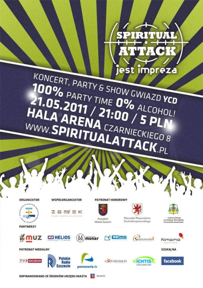 Forum Młodzieży Archidiecezji Szczecińsko-Kamieńskiej pod patronatem Księdza Arcybiskupa Metropolity Andrzeja Dzięgi i pod patronatem Prezydenta Miasta Szczecin oraz Marszałka Województwa Zachodniopomorskiego, we współpracy z Wydziałem Duszpasterskim Kurii Metropolitalnej, Stowarzyszeniem Przyjaciół DA RAZEM, Domem Kultury „13 muz”, Zamkiem Książąt Pomorskich oraz Urzędem Wojewódzkim organizuje jedyną w swoim rodzaju, pierwszą w Szczecinie i szóstą w Polsce imprezę bez używek Spiritual Attack, która odbędzie się w Szczecinie, w dniu 21 maja 2011 r. Wydarzenie będzie miało miejsce w największym szczecińskim klubie Hala Arena przy Heya Club, przy ul. Czarneckiego 8.
