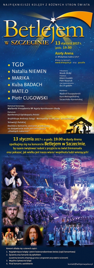 Podczas tego wydarzenia spotykają się ludzie z całej Polski, aby wspólnie kolędować i świętować Boże Narodzenie. Trasa koncertowa Betlejem w Polsce 2016/2017 ma na celu stworzyć wielką wspólnotę wiary i klimatu międzyludzkiej bliskości. Zbuduje go nie tylko muzyka na najwyższym, światowym poziomie i wspólne śpiewanie. Umocni je także czas dedykowany innym – bliższym i dalszym – uczestnikom koncertu. Każdy uczestnik koncertu, przy wejściu otrzyma program wraz z opłatkiem. W programie koncertu znajduje się łamanie opłatkiem i składanie życzeń. Podczas koncertu usłyszymy także życzenia od duchownych i świeckich włodarzy miasta.