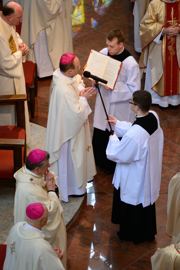 W Wielki Czwartek przed południem w Bazylice Archikatedralnej w Szczecinie została odprawiona Msza św. Krzyżma. Biskupi i prezbiterzy zgromadzeni wokół ks. abpa Andrzeja Dzięgi, metropolity szczecińsko-kamieńskiego odnowili swoje kapłańskie przyrzeczenia. W czasie Mszy św. miała też miejsce promocja kilkudziesięciu lektorów z całej archidiecezji szczecińsko-kamieńskiej. Fot. D. Rynkiewicz.