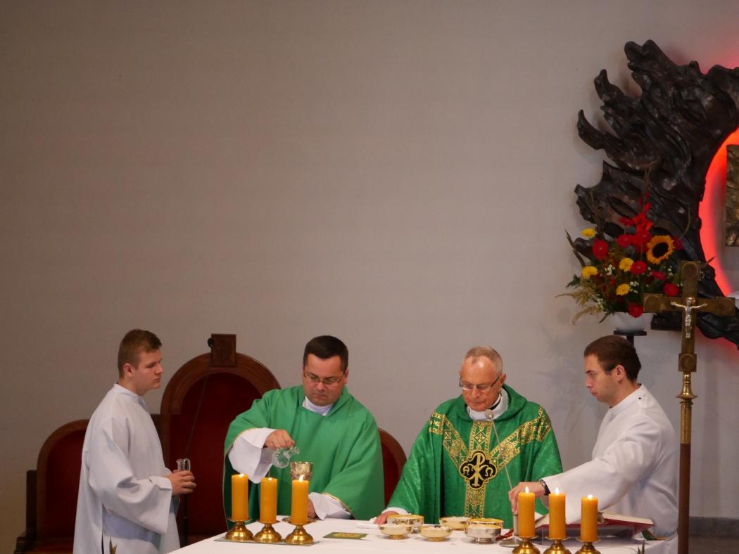 Po tych wystąpieniach, wszyscy uczestniczyli we Mszy świętej, której przewodniczył i homilię wygłosił ks. bp Antoni Długosz. Przypomniał o wizycie papieża Franciszka w Polsce, w czasie której  wraz z polskim rządem dziękował za 1050 lat chrześcijaństwa w naszym narodzie. „Dzięki temu sakramentowi możemy dzisiaj w szczególny sposób realizować naszą misję proroków Jezusa Chrystusa” – mówił do katechetów kaznodzieja. Następnie stwierdził, że „najważniejsze w życiu każdego katechety jest to, by postępował tak jak naucza Chrystus”, ponieważ „dzieci i młodzież pragną, abyśmy byli świadkami tej prawdy jaką im przekazujemy”. Zwrócił uwagę na to, że misja katechety będzie skuteczna tylko wtedy, jeżeli będziemy katechizowali również rodziców naszych uczniów i przypominali im, że „to oni są pierwszymi świadkami wiary w życiu swoich dzieci; że są pierwszymi katechetami. My jesteśmy na usługach rodziny, ale nigdy nie zastąpimy świadectwa rodziców”. Na zakończenie zachęcał słuchaczy, żeby w kontekście przeżywanego Roku Miłosierdzia Bożego, modlitwa św. Faustyny była modlitwą każdego katechety: „Panie Jezu, daj mi Twoje oczy, abym nimi patrzyła na ludzi; daj mi Twoje ręce, abym przez nie mogła czynić dobro; daj mi Twoje serce, abym nim pokochała każdego człowieka”. Po Komunii Świętej, na prośbę Ks. Dyrektora, ks. Biskup udzielił specjalnego błogosławieństwa katechetom, którzy w tym roku rozpoczynają pracę w naszej archidiecezji.