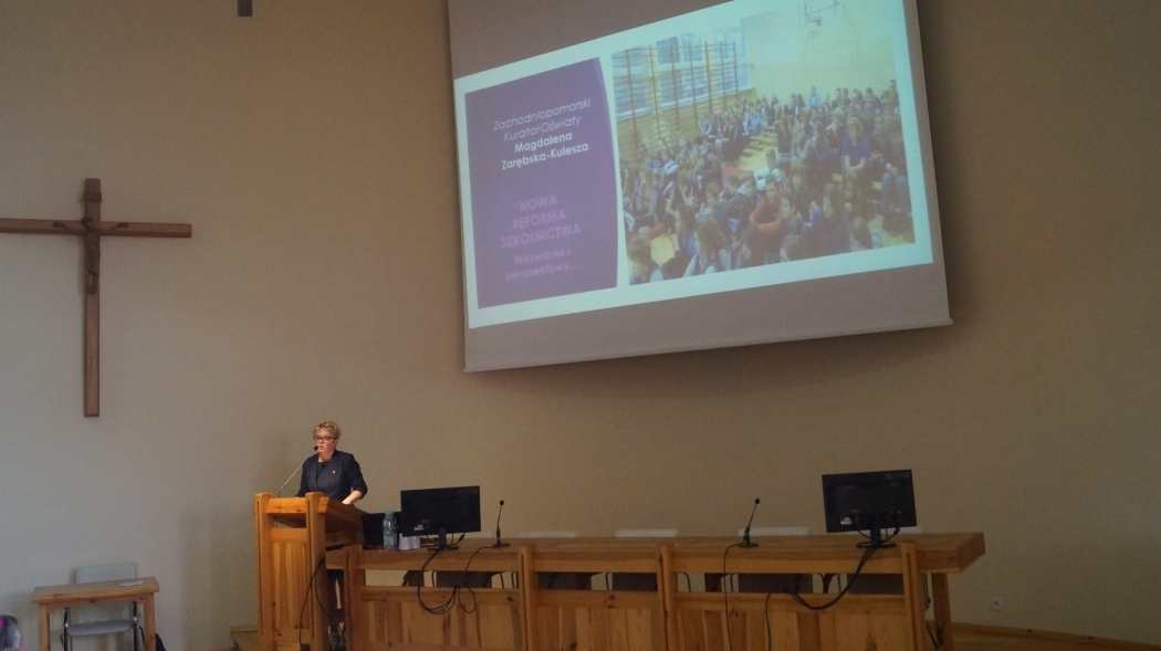 „Nowa reforma szkolnictwa – wyzwania i perspektywy”, to temat wystąpienia pani kurator Magdaleny Zarębskiej – Kuleszy, w którym zostały przedstawione główne założenia reformy. „Szkoła moich marzeń jest możliwa. Uczciwie ucząc matematyki, wymagając od uczniów czytania wspaniałych lektur, zachęcając do korzystania z oferty kulturalnej stolicy naszego województwa dajemy szansę młodym ludziom na dobry start w kolejnych etapach edukacyjnych i spełnienie marzeń” – podkreśliła pani Kurator. Wystarczy pamiętać wypowiedziane 400 lat temu słowa Jana Zamojskiego „Takie będą Rzeczpospolite jakie ich młodzieży chowanie”. Praca z dziećmi i młodzieżą  powinna być przyjemnością. I tego należy życzyć wszystkim nauczycielom, rodzicom i uczniom. To jest najważniejsze  zadanie szkoły. Na tym powinni się skupić wszyscy uczestnicy systemu oświaty – dodała. Podczas spotkania Zachodniopomorska Kurator przedstawiła również zapowiedziane przez Ministerstwo Edukacji Narodowej zmiany w systemie oświaty, podkreślając, że zostały one zainicjowane na wniosek wielu różnych środowisk. Do najważniejszych decyzji porządkujących system edukacji, które będą realizowane w roku szkolnym 2016/2017 wymienić można zniesienie obowiązku szkolnego dla sześciolatków, likwidację sprawdzianu po klasie szóstej, możliwość niezależnego odwołania się od wyniku egzaminu maturalnego, zniesienie restrykcyjnego rozporządzenia dotyczącego sklepików szkolnych, czy ujednolicenie terminologii organizacji roku szkolnego oraz zniesie od 1 września 2016 r. tzw. „godzin karcianych”. Natomiast oprócz dotychczas wprowadzonych zmian pod koniec czerwca Ministerstwo wskazało również kierunki polityki oświatowej na najbliższe lata. Są to propozycje, które powstały po wielu spotkaniach z nauczycielami, uczniami, rodzicami, przedstawicielami jednostek samorządu terytorialnego, przedstawicielami związków zawodowych, organizacjami pozarządowymi oraz innymi osobami zainteresowanymi tematyką oświatową.