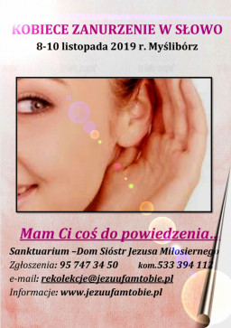 Siostry Jezusa Miłosienego z Myśliborza zapraszają dziewczęta, które ukończyły 18 rok życia i wszystkie kobiety pragnące pobyć z Bogiem w ciszy, na Kobiece Zanurzanie w Słowo, w dniach 8-10 listopada 2019 r., w domu zakonnym przy Sanktuarium Miłosiedzia Bozego w Myśliborzu.