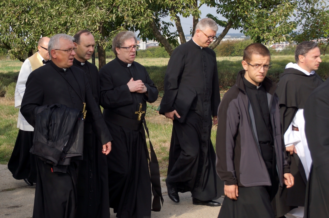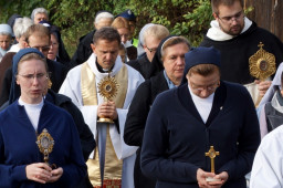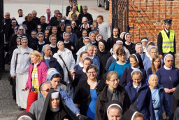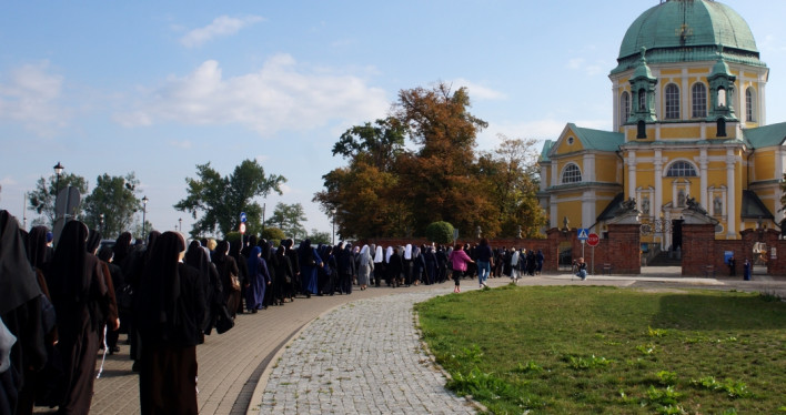 Najpierw, w kościele farnym pw. św. Małgorzaty osoby konsekrowane zebrały się na krótką modlitwę, aby procesyjnie ruszyć na Świętą Górę. Rzeczywiście przemarsz robił wrażenie. Kilkaset sióstr zakonnych i kilkudziesięciu zakonników, a także osoby żyjące w osobistej konsekracji, trzymając w dłoniach relikwiarze założycieli i założycielek swoich zakonów stworzyli prawdziwy, barwny korowód. Barwy były w prawdzie stonowane, tak jak zakonne habity, ale tu i ówdzie pobłyskiwały złotem relikwiarze. W znaku swoich relikwii towarzyszyli nam: św. Dominik, bł. Honorat Koźmiński, św. Filip Neri, bł. Matka Teresa z Kalkuty, bł. Angela Truszkowska, św. Jadwiga Królowa, św. Jan Bosko i św. Małgorzata Maria Alacoque.