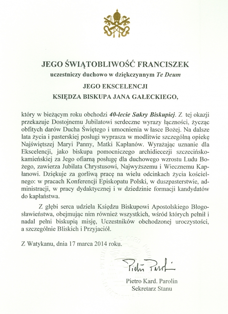 Biskup pomocniczy senior Jan Gałecki obchodził 40. rocznicę sakry biskupiej. Z tej okazji Dostojny Jubilat przewodniczył uroczystej Mszy Świętej w Bazylice Archikatedralnej św. Jakuba Apostoła w Szczecinie, w niedzielę, 23 marca br., o godz. 18.00. Homilię wygłosił Ksiądz Arcybiskupa Metropolita Andrzej Dzięga. Z okazji tej uroczystości, w imieniu Ojca Świętego Franciszka, list do Jubilata skierował Sekretarz Stanu Stolicy Apostolskiej, Kardynała Pietro Parolin.