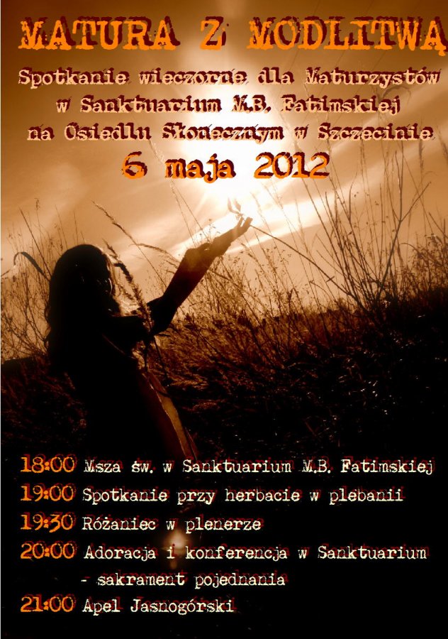 W niedzielę 6 maja odbędzie się czuwanie modlitewne tegorocznych maturzystów w Sanktuarium Matki Bożej Fatimskiej, na Osiedlu Słonecznym w Szczecinie.