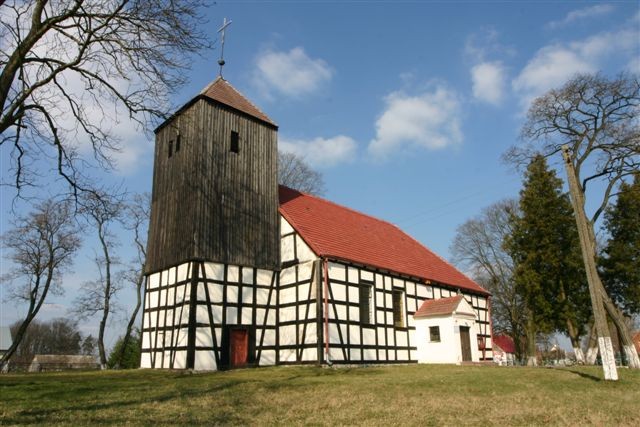 • Kościół z 1756 r. o konstrukcji szkieletowej z ceglanym wypełnieniem kwadr. W 1967 r.ze względu na zły stan techniczny, w całości przemurowany cegła.W 1993 r.na elewacjach nabito deski imitujące pierwotną konstrukcję.Wieża z XVIII w. o konstrukcji szkieletowej , drewnianej.